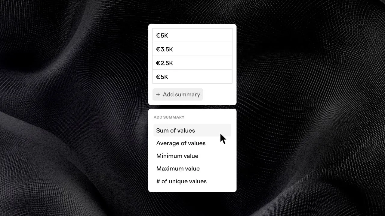 Get quick insights with automatic sums, averages, min/max values, and unique value counts for any numeric fields.